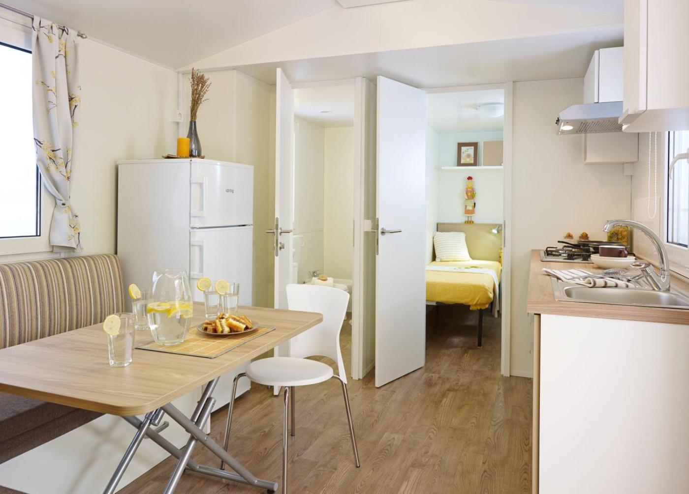 Three - Bedroom Mobile Home with Terrace. Boasting a private entrance, this air-conditioned holiday home includes a kitchen, 2 bedrooms and 1 bathroom with a shower and a hairdryer. Meals can be prepared in the well-fitted kitchen, which is fitted with a stovetop, a refrigerator and a microwave. Featuring a terrace with garden views, this holiday home also offers soundproof walls and a flat-screen TV with satellite channels. The unit has 3 beds.