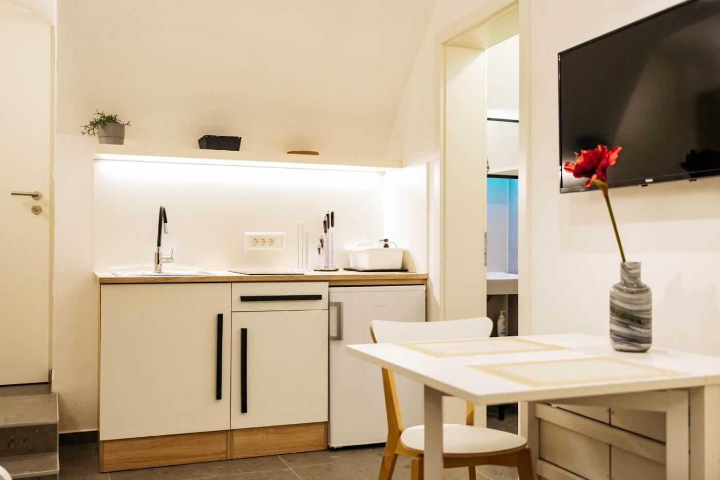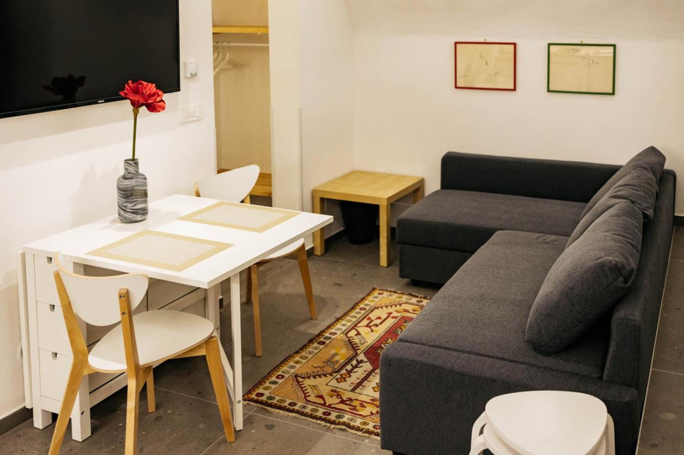 One-Bedroom Apartment. Featuring a private entrance, this apartment is comprised of 1 living room, 1 separate bedroom and 1 bathroom with a walk-in shower and a hairdryer. Guests can make meals in the kitchenette that comes with a stovetop, a refrigerator, kitchenware and a toaster. The apartment features tiled floors, a seating area with a flat-screen TV, soundproof walls, a dining area as well as ancourtyard view. The unit offers 2 beds. ;