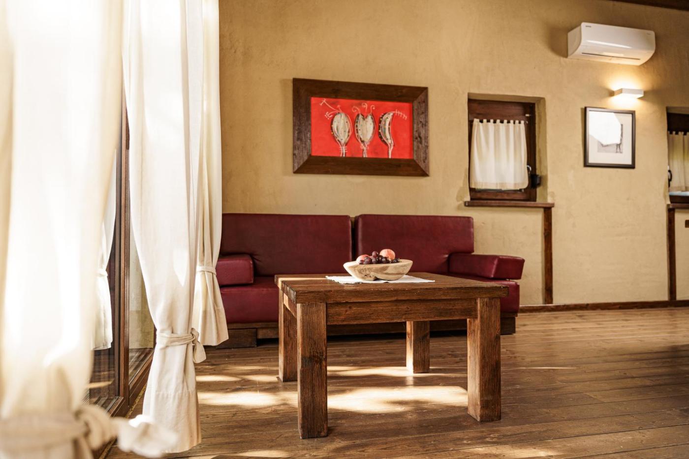 Two-Bedroom Villa. Handcrafted entirely out of natural and eco materials, this two bedroom villa features a furnished terrace. It is decorated in rustic wooden style and comprises a living room with flat-screen cable TV, a fully equipped kitchen with spacious dining area and 2 bathrooms with a washing machine. ;
